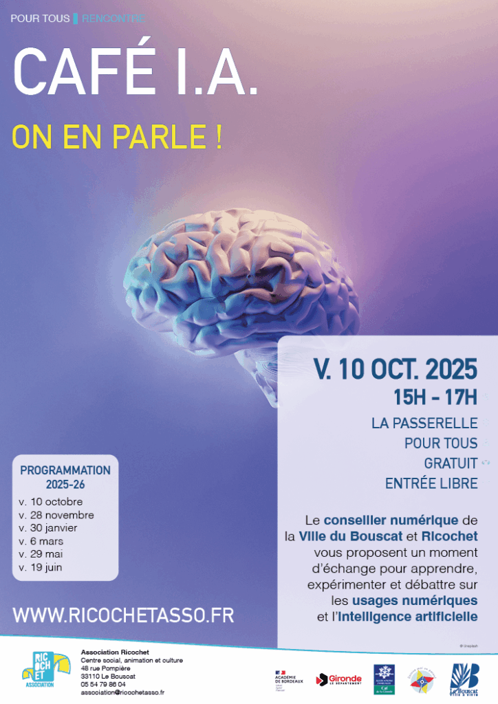 Le conseiller numérique de la Ville du Bouscat et Ricochet vous propose un Café I.A. pour permettre à toutes et à tous de s’emparer des enjeux de l’intelligence artificielle à travers des temps d’échange locaux, accessibles et démocratiques.