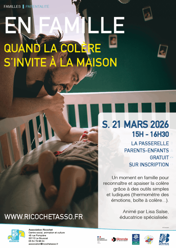 Un moment en famille pour reconnaître et apaiser la colère grâce à des outils simples et ludiques (thermomètre des émotions, boîte à colère…).