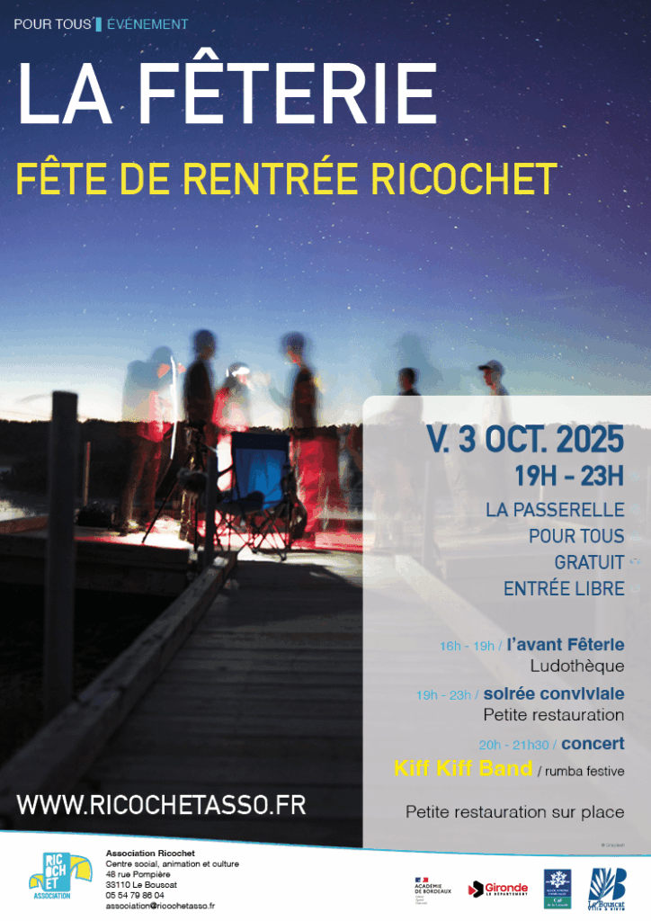 L’association Ricochet a le plaisir de vous inviter à sa Fêterie de rentrée, et invite Kiff Kiff Band / rumba festive.