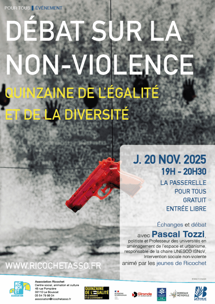Dans le cadre de la Quinzaine de l’égalité et de la diversité au Bouscat, nous avons le plaisir de vous inviter à une soirée conférence-débat sur la non-violence en présence de Pascal Tozzi.