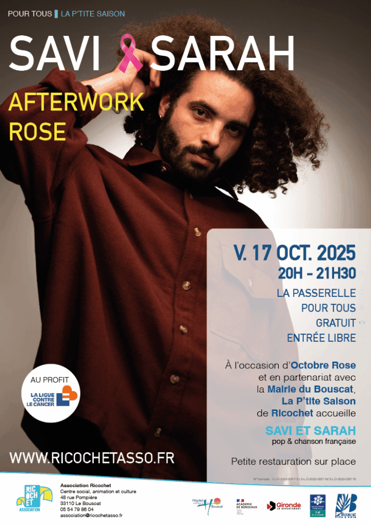 Dans le cadre de la P’tite Saison et à l’occasion d’Octobre Rose au Bouscat, l’association Ricochet a le plaisir d’accueillir Savi & Sarah / pop-chanson française.